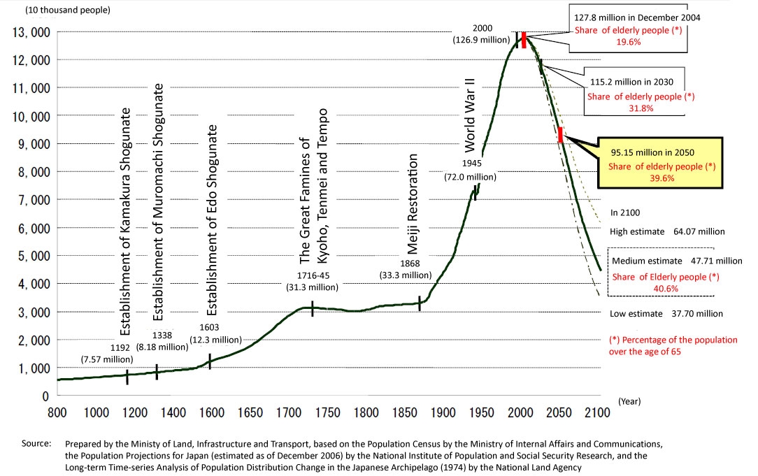 Japan’s population is declining at a rapid rate as the average age of its citizens climbs. Having peaked at nearly 128 million people in 2004, when those aged 65 or over comprised about 20%, the population is expected to drop to 95 million by 2050, when the share of senior citizens will be about 40%.